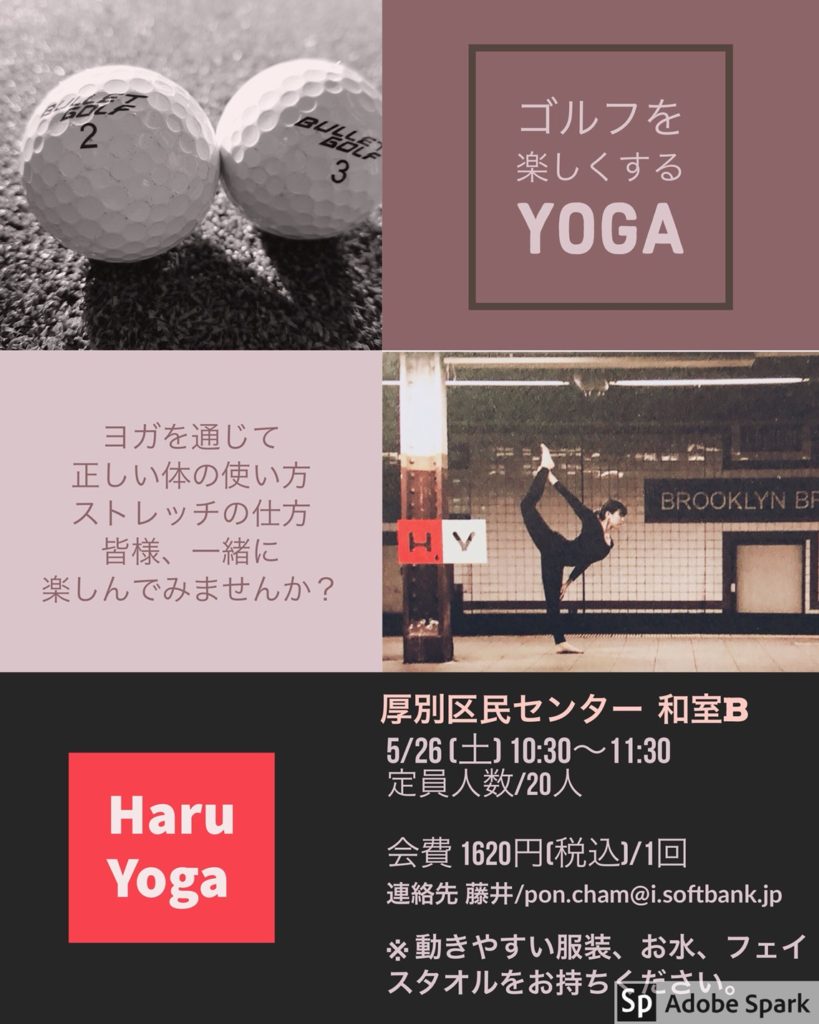 5/26(土)ゴルフを楽しくするyogaを開催します!! 今回は畳でヨガをします♪ 私も畳ヨガは初体験です!! 畳でヨガをやってみたい方も 是非参加お待ちしております(^o^) ご予約はハルヨガのホームページ お問い合わせフォームか 私、藤井に直接ご連絡ください! 厚別区民センターと少しばかり 遠いのですが(´・А;・) 皆様のご参加、心よりお待ちしております( ・∀・)b しかし我ながら広告 上手につくれたと自画自賛してます笑 CHIHIRO